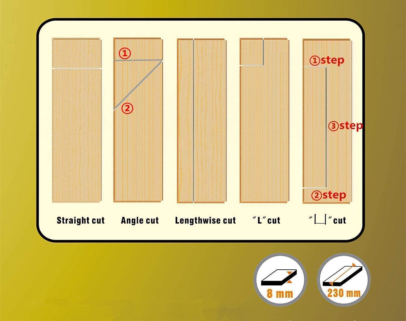 - Straight cut, Angle cut; �� L & ��� cut and Lengthwise cut (Soluring gve the installation of wall and corner). Clearly marked measuring guide. 0-45 Angle Cutting, Cutting max.depth 8mm.Translational cutting,the deep of the throat is 115mm/4.5inch.Easy to use and to carry around, you will like it�
