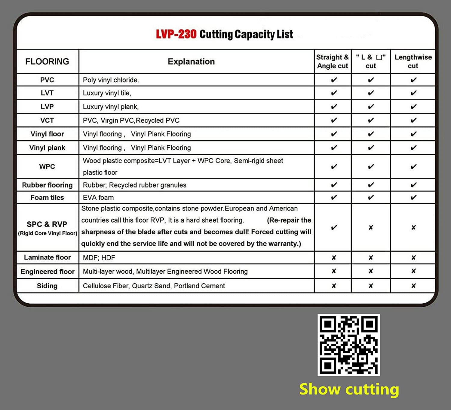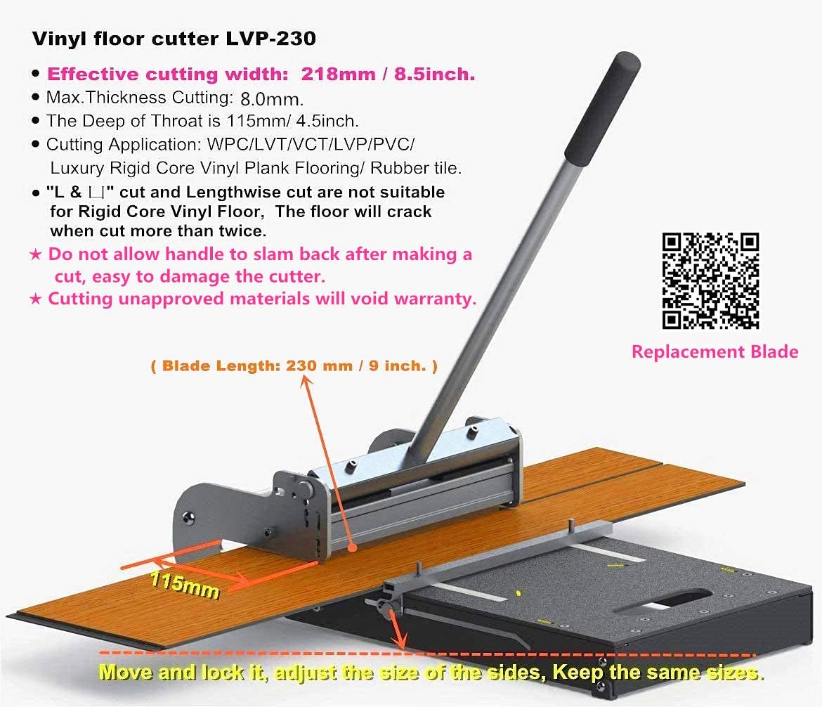 - Design for cutting LVP, WPC, SPC, LVT, VCT, PVC, Vinyl Plank Flooring. Cutting unapproved materials will void warranty.